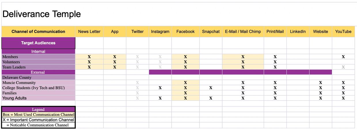 The client shared they had faced challenges around messaging and branding. To help with consistency in message design, Vonlongmire created a Target Audience chart. This ensures the efficacy of message design for appropriate channels of communication with target audiences. This chart serves as a general guide of best practices.